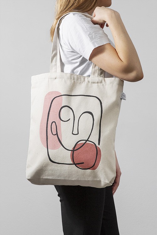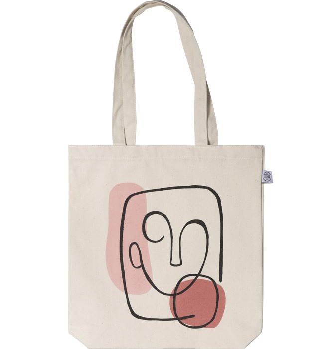 – Béžová plátěná taška s motivem abstraktní ilustrace obličeje s dvěma obrazci, tištěno na přední straně