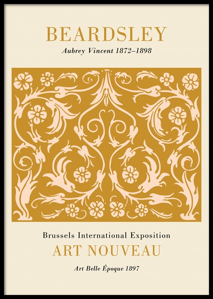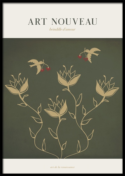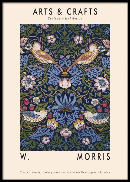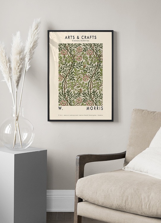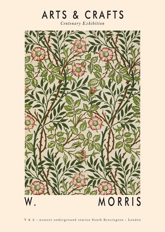 Ilustrace s motivem červených květin, zelených listů a textem "Arts & Crafts" v horní části a dalším textem pod motivem, to vše na na béžové pozadí. Tento styl inspirovaný Williamem Morrisem z módy podle nás v dohledné době nevyjde. Tlumené barvy a květinový vzor tvoří dokonalou kombinaci retra a moderního stylu.