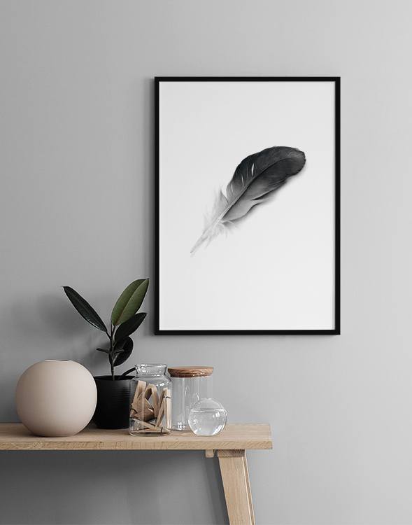 Posters, affischer i svartvitt. Snygg tavla med fjäder. Nordisk inredning.