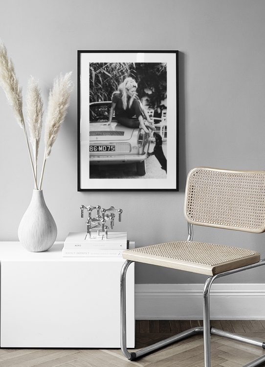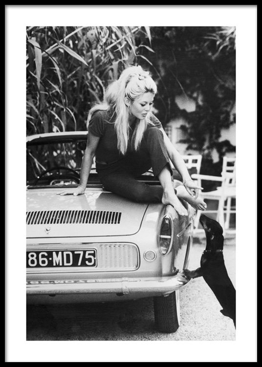 Design Osobní výběr Černobílá fotografie Brigitte Bardot sedící na autě natahující se dolů ke psovi. Brigitte Bardot byla jednou z největších ikon své doby a zanechala po sobě velký odkaz.