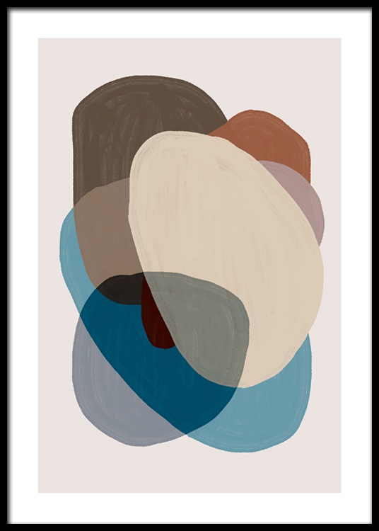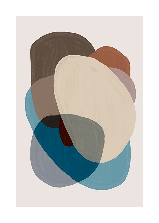 Design Osobní výběr Malba s překrývajícími se modrými, béžovými a hnědými obrazci na béžovém pozadí. Tento tisk ve vašem domově navodí moderní atmosféru a díky svým zemitým tónům i pocit klidu. Spárujte jej s dílem „Browns a Blues No1“ a získejte umění, které se k sobě hodí.