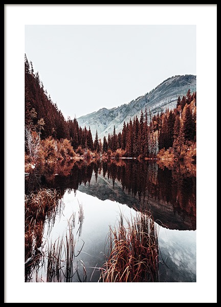 Design Osobní výběr Fotografie jezera při západu slunce s červenými stromy v popředí a horami na pozadí. Tento krásný tisk dokonale zachycuje krásu přírody a všechny její divy. Dejte svému domácímu interiéru zasloužené oživení pomocí tohoto teplého tisku, skvěle se hodí pro milovníky přírody.