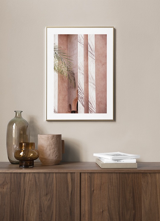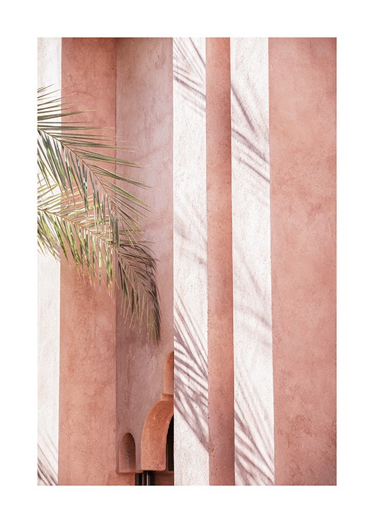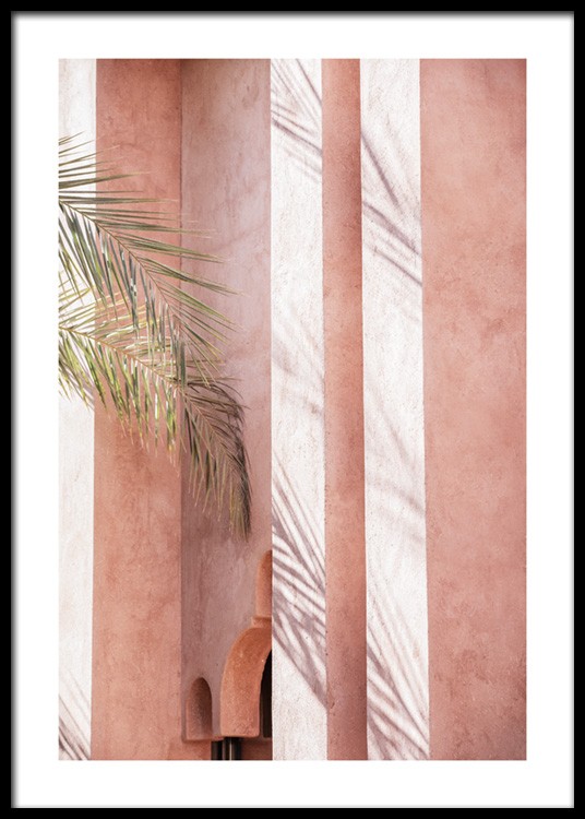 Design Osobní výběr Fotografie stínu na růžové budově s velkými palmovými listy po levé straně. Díky jasným a barevným tiskům získá váš domov během okamžiku nový vzhled. Tento tisk pochází z kolekce Studia Amara, kterou vypracoval tým Desenio Design Studio v Marrákeši.