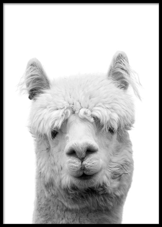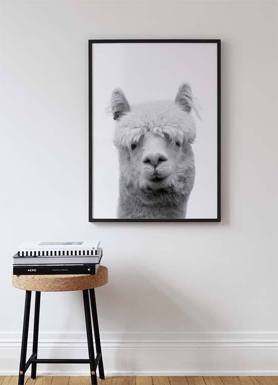 Černobílý plakát lamy. Tento zvířecí motiv se hodí stejně dobře do obývacího pokoje jako do dětského pokoje. Slaďte jej s ostatními černobílými fotografiemi.