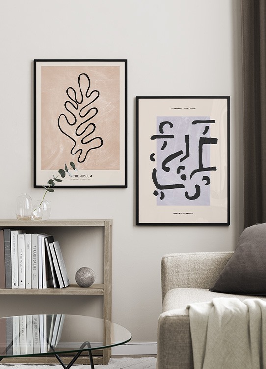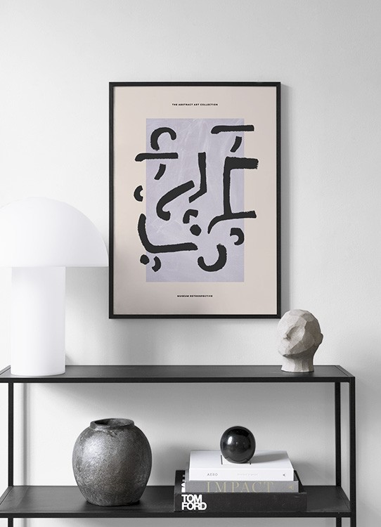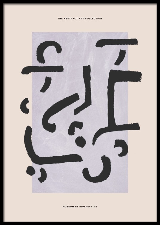 Design Osobní výběr Grafická ilustrace s černými abstraktními tvary na fialovém obdélníku s béžovým pozadím a černým textem v horní a dolní části. Díky tomuto uměleckému tisku váš interiér získá moderní vzhled a skvěle se hodí k vytvoření trendy stylu.