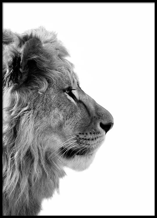 Design Osobní výběr Černobílá fotografie lva z profilu. Tato silná fotografie se hodí na stěnu, kterou si doma chcete zvýraznit. Zvířecí tisky se skvěle hodí do interiéru, který byste chtěli oživit. Snadno je sladíte s jinými tisky k vytvoření výrazné nástěnné galerie, která se vám bude líbit.