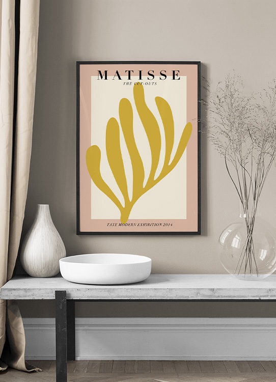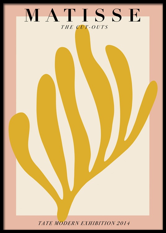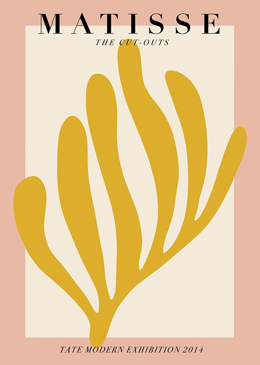 Design Osobní výběr Grafická ilustrace žlutého korálu na béžovém pozadí s růžovým obrysem a textem „Matisse The Cut-outs“ v horní části. Tento plakát se skvěle hodí do moderního domova, ve kterém chcete, aby dominovalo abstraktní a grafické umění. Díky tomu všemu se skvěle hodí k plakátu „Matisse Papiers“.