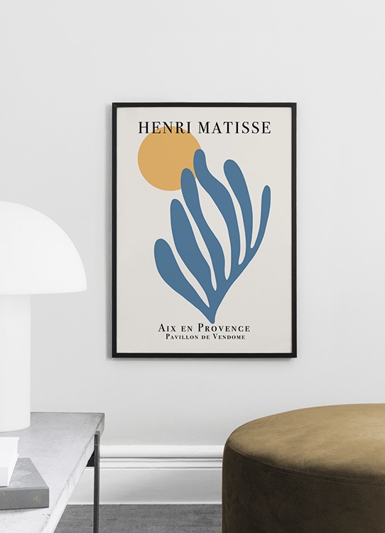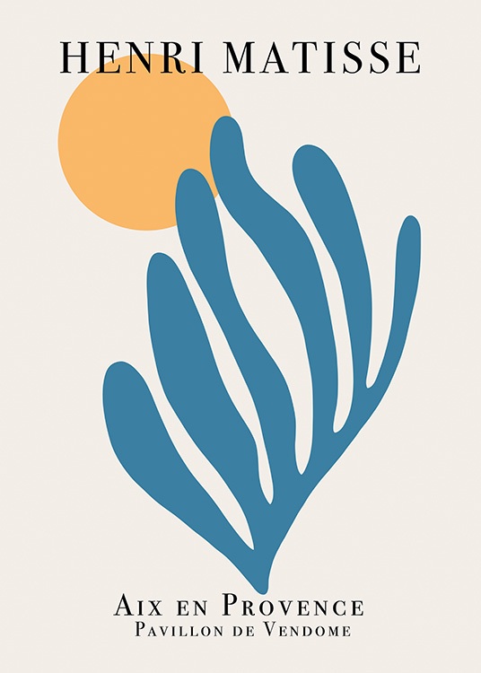 Design Osobní výběr Grafická ilustrace modrého korálu a oranžového kruhu na tlumeně bílý pozadí s textem „Henri Matisse“ v horní části. Pokud vás umění od Matisseho inspiruje stejně jako nás, tento tisk by vám doma neměl chybět. Více hodících se motivů naleznete mezi našimi tisky inspirovanými uměním od Matisse.