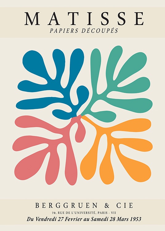 Design Osobní výběr Grafická ilustrace s korály v modré, zelené, červené a oranžové barvě na béžovém pozadí, s nápisem „Matisse Papiers Découpés“ v horní části a textem dole. Henri Matisse vedl cestu k modernímu umění a tento tisk váš interiér zaručeně a zaslouženě oživí. Dokonale se hodí k plakátu „Matisse Cutouts“.