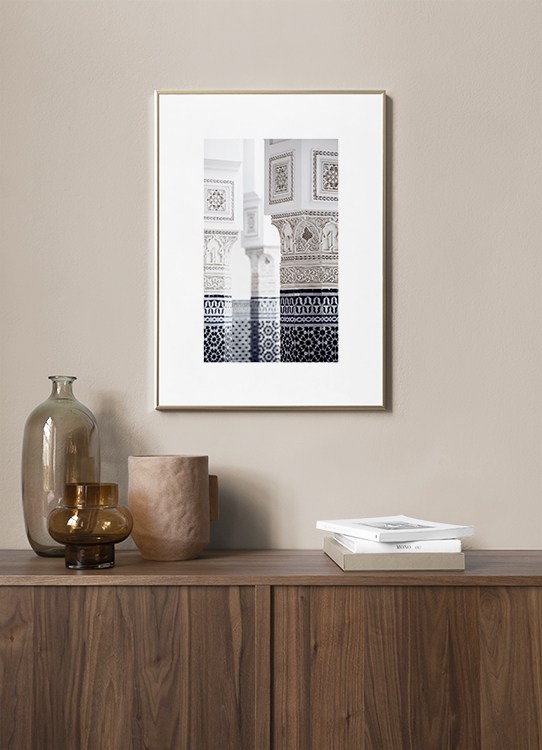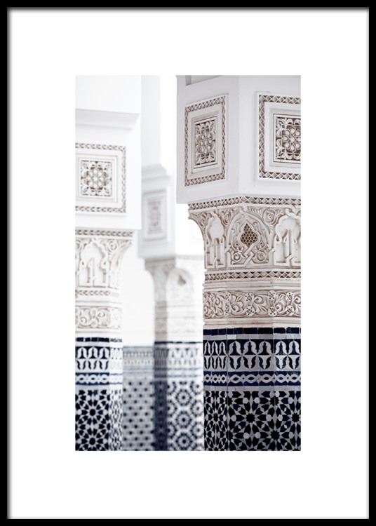 Design Osobní výběr Detailní fotografie pilířů s modrými a bílými vzory. Váš interiér bude díky fotoumění z Marrákeše, které je plné příjemných pastelů a krásných vzorů, vypadat jako nový. Tento tisk pochází z kolekce Studia Amara, kterou vypracoval tým Desenio Design Studio v Marrákeši.
