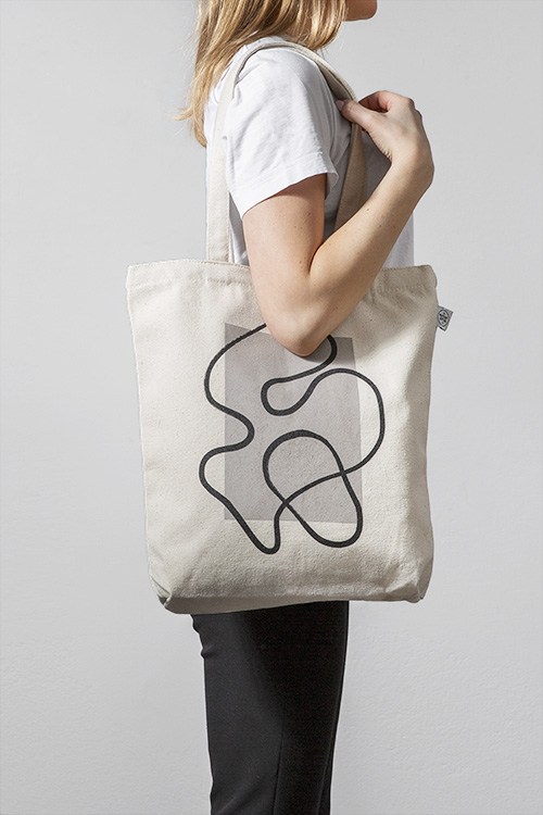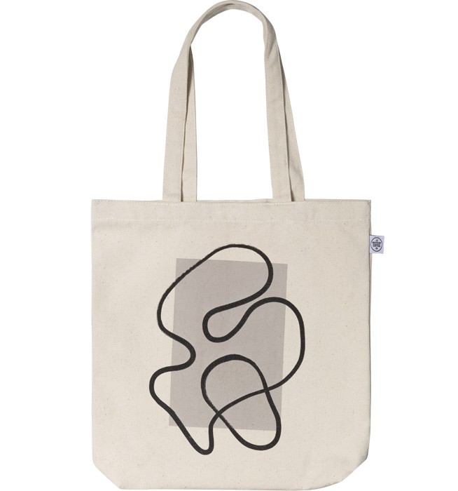 – Béžová plátěná taška s černým tahem štětce na tmavě béžovém obdélníku, tištěno na přední straně