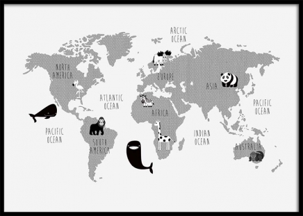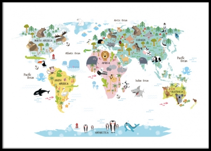 Díky této mapě světa pro děti můžete zábavnou formou vaše dítě učit o světě kolem nás. V naší kolekci nabízíme milé a vtipné designy, které se vašim dětem budou líbit. Tento plakát je zaměřený na barvy a roztomilé ilustrace. Ukazujte na zvířata a místa na mapě, aby si je vaše dítě procvičilo. Naše plakáty jsou zábavné a milé a snadno upoutají pozornost vašich nejmenších.