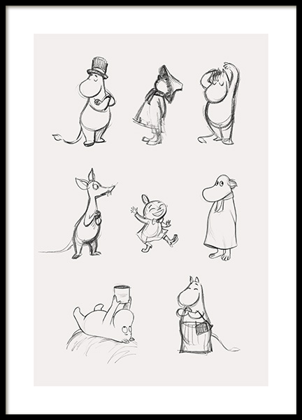 Na těchto tiscích naleznete všechny své oblíbené postavičky z Údolí muminků. Najděte svůj oblíbený tisk s Mumínkem, Mumínkovou maminkou a tatínkem, Šňupálkem, slečnou Ferkou, Miou, Čenichem a nebo panem Bambulou. Tímto uměním skvěle obměníte pokoj vaší ratolesti. Hravé a zábavné tisky, ale i tak stylové, tuto kombinace jen tak něco neporazí. Ručně kreslené detaily dávají tomuto motivu autentický charakter a díky pastelovému pozadí spolu skvěle vyniknou v nástěnné galerii.