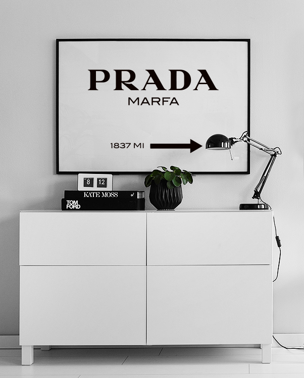 Design Osobní výběr Černobílý tisk s logem Prada Marfa. Moderní klasika! Toto logo Prada Marfa má jednoduchý, ale elegantní design, který si snadno zkombinujete s jinými našimi módními plakáty k sestavení trendy nástěnné galerie. Skvěle se hodí do pokoje teenagera, který si chce vytvořit vlastní atmosféru ve svém pokoji.