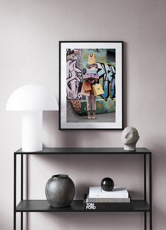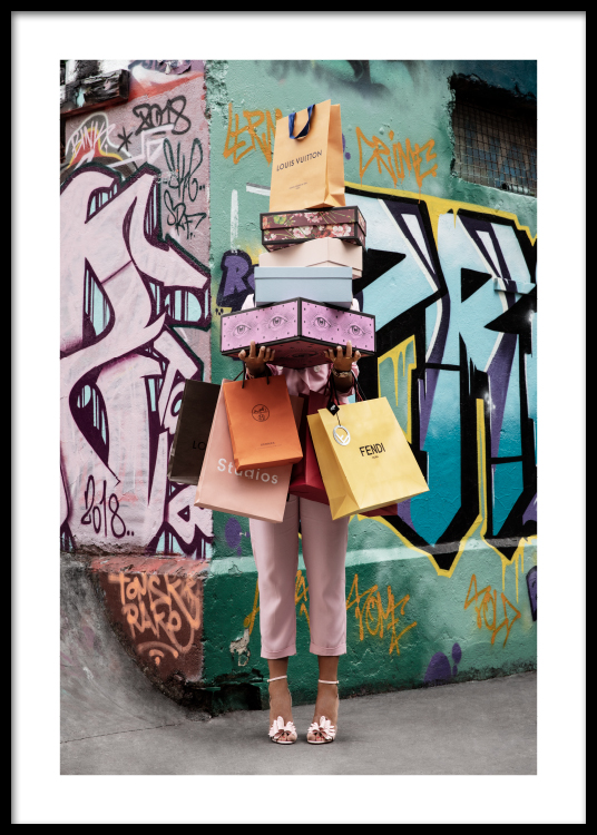 Fotografie ženy, která před sebou drží nákupní tašky a krabice, s pograffitovanou zdí na pozadí. Design je součástí fotokolekce Studio Stadtkind, kterou vypracoval tým Desenio Design Studio ve spolupráci s německou influencerkou Aylin König v roli modelky a múzy.