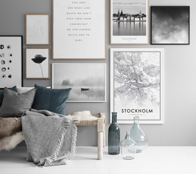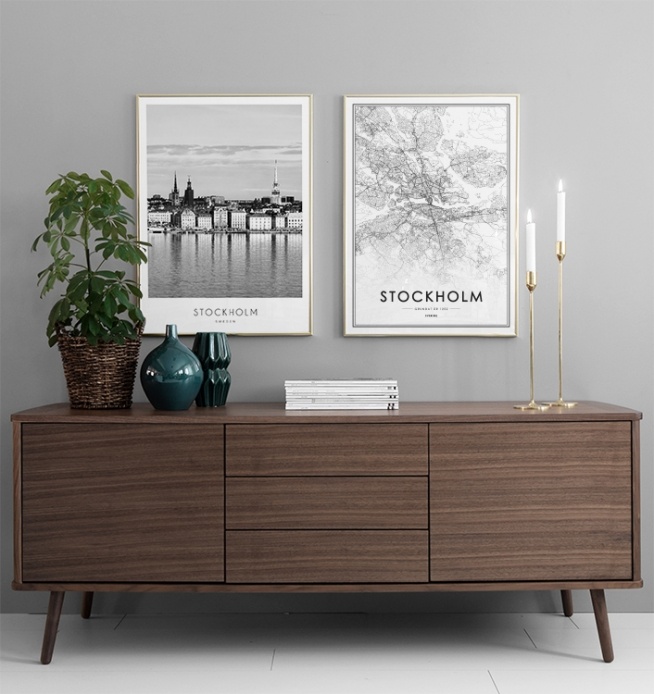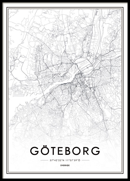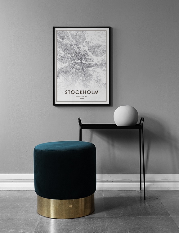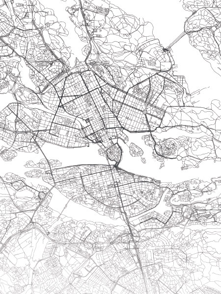 Poster / tavla med Stockholmskarta. Svartvit karta över Stockholm.