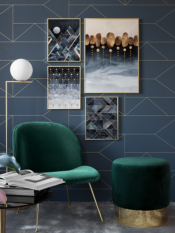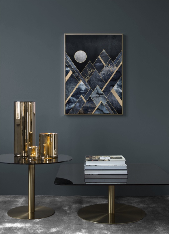 Design Osobní výběr Motiv vytvořila Elisabeth Fredriksson. Stylový grafický plakát v modrých odstínech a se zlatými detaily hezky ozdobí vaši zeď. Pověste si na stěny moderní plakáty, které se vám libí a které vás inspirují, abyste si oživili interiér a dodali mu osobnější nádech. Nejste si jistí, jak vaše obrazy pověsit? V naší kategorii „Inspirace“ najdete tipy a nápady, jak si plakáty pověsit.