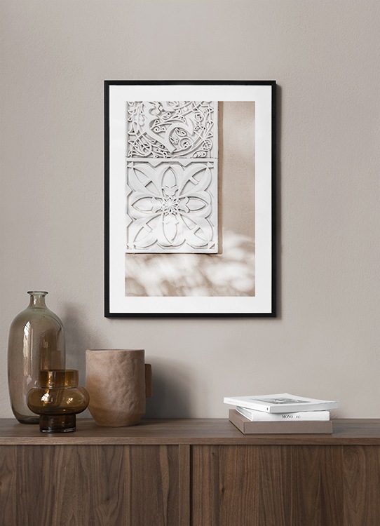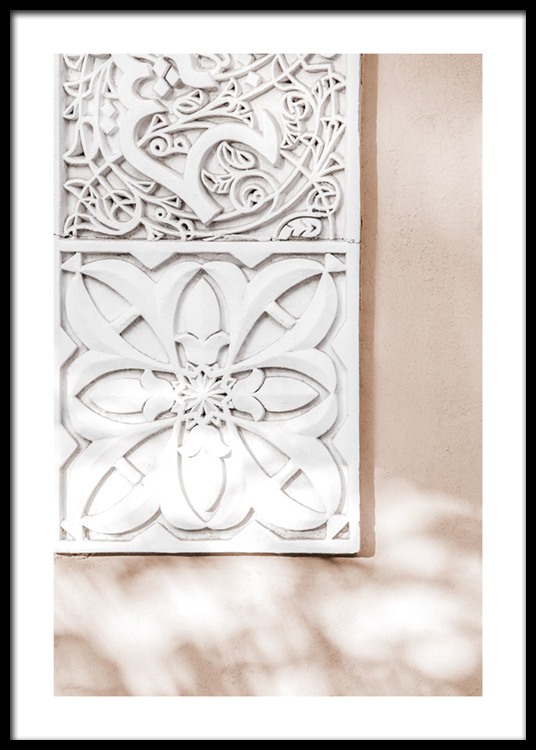 Design Osobní výběr Detailní záběr na bílé dlaždice s vyřezávanými vzory na světle růžové stěně. Lidský odkaz Marrákeše tvořený smyslem pro detail je opravdu něco znamenitého. Tento tisk pochází z kolekce Studia Amara, kterou vypracoval tým Desenio Design Studio v Marrákeši.