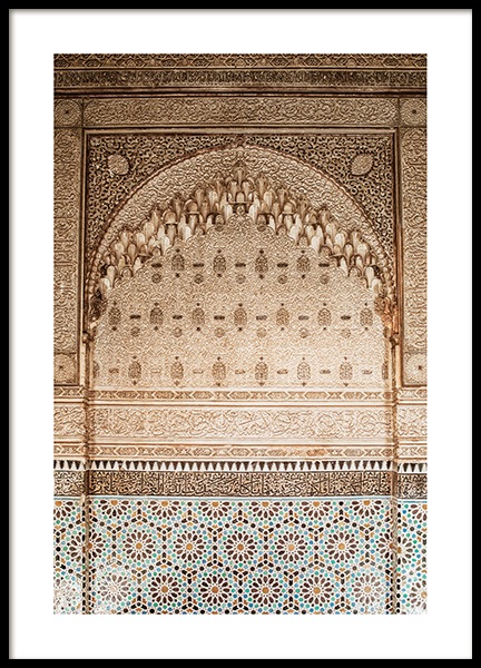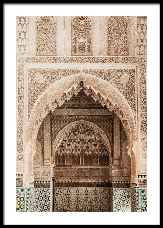 Design Osobní výběr Fotografie zlatého chrámu s obloukovitou klenbou a vyřezávanými detaily. Toto místo plné umělecký, propracovaných detailů je opravdu kouzelné. Tento tisk pochází z kolekce Studia Amara, kterou vypracoval tým Desenio Design Studio v Marrákeši.