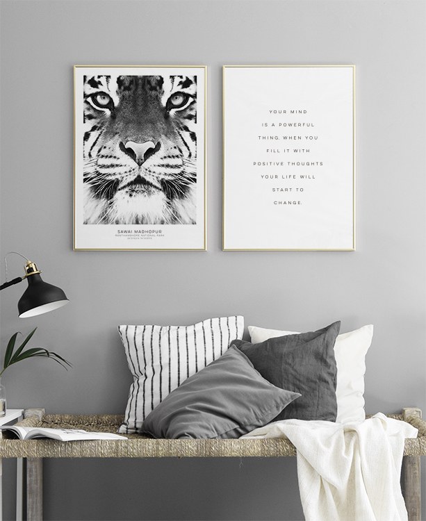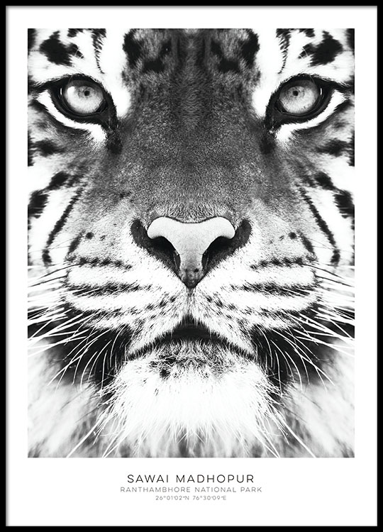 Černobílý plakát s uměleckou fotografií tygra. Stylové plakáty online