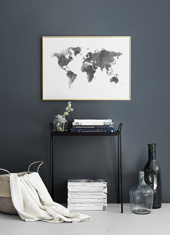Poster med världskarta i grått och vitt målat med vattenfärg.