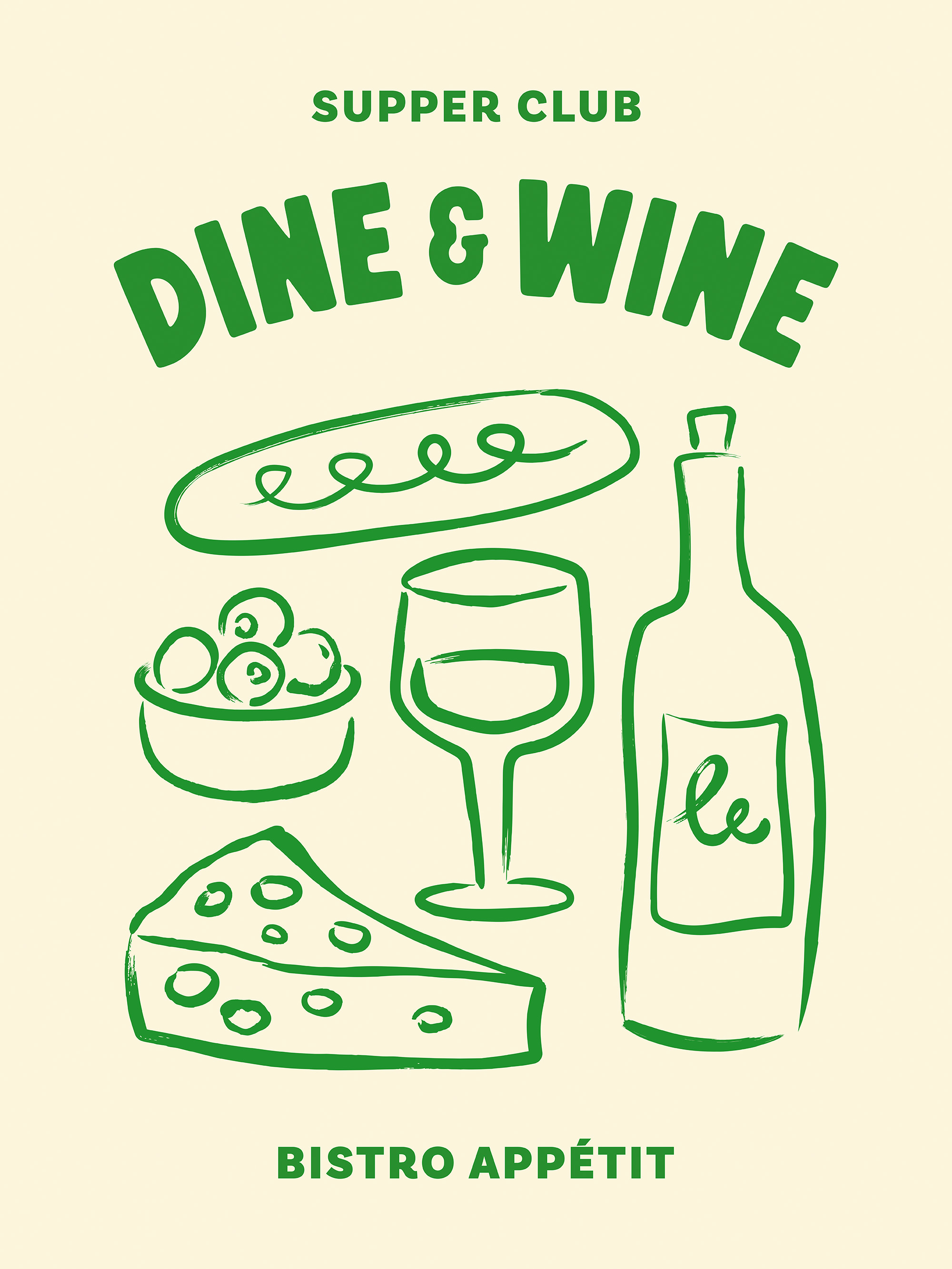 Nástěnná galerie se třemi plakáty s ilustracemi italského jídla a vína v červené a zelené, s textem "BUON APPETITO".