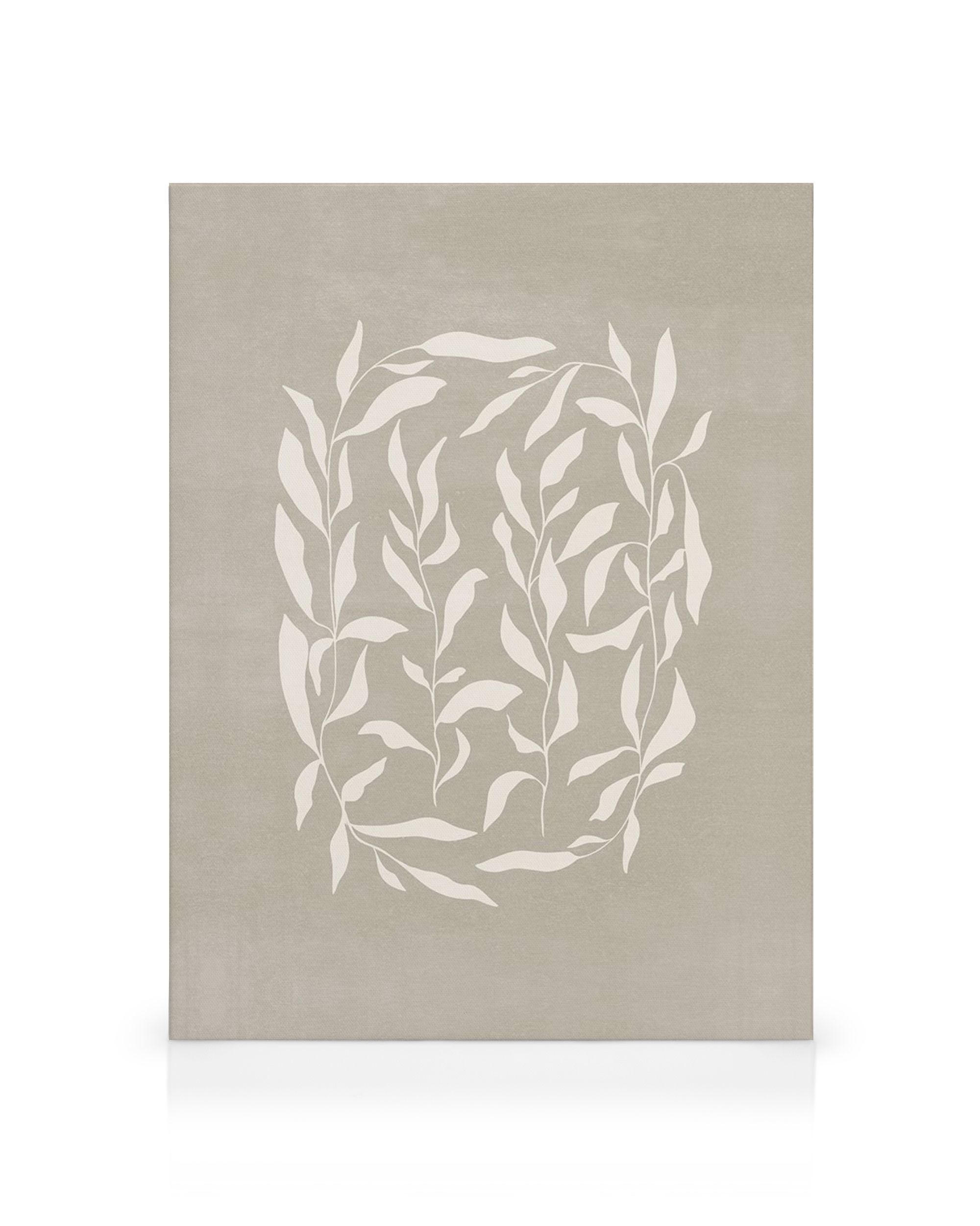 Ilustrace bílých listů v šedém obdélníku na světle šedém pozadí s textem v horní a dolní části. Monochromatické barvy vytvoří ve vašem domove stylový vzhled. Tento plakát se bude na stěně nejlépe vyjímat v kombinaci s plakáty s černobílou fotografií
