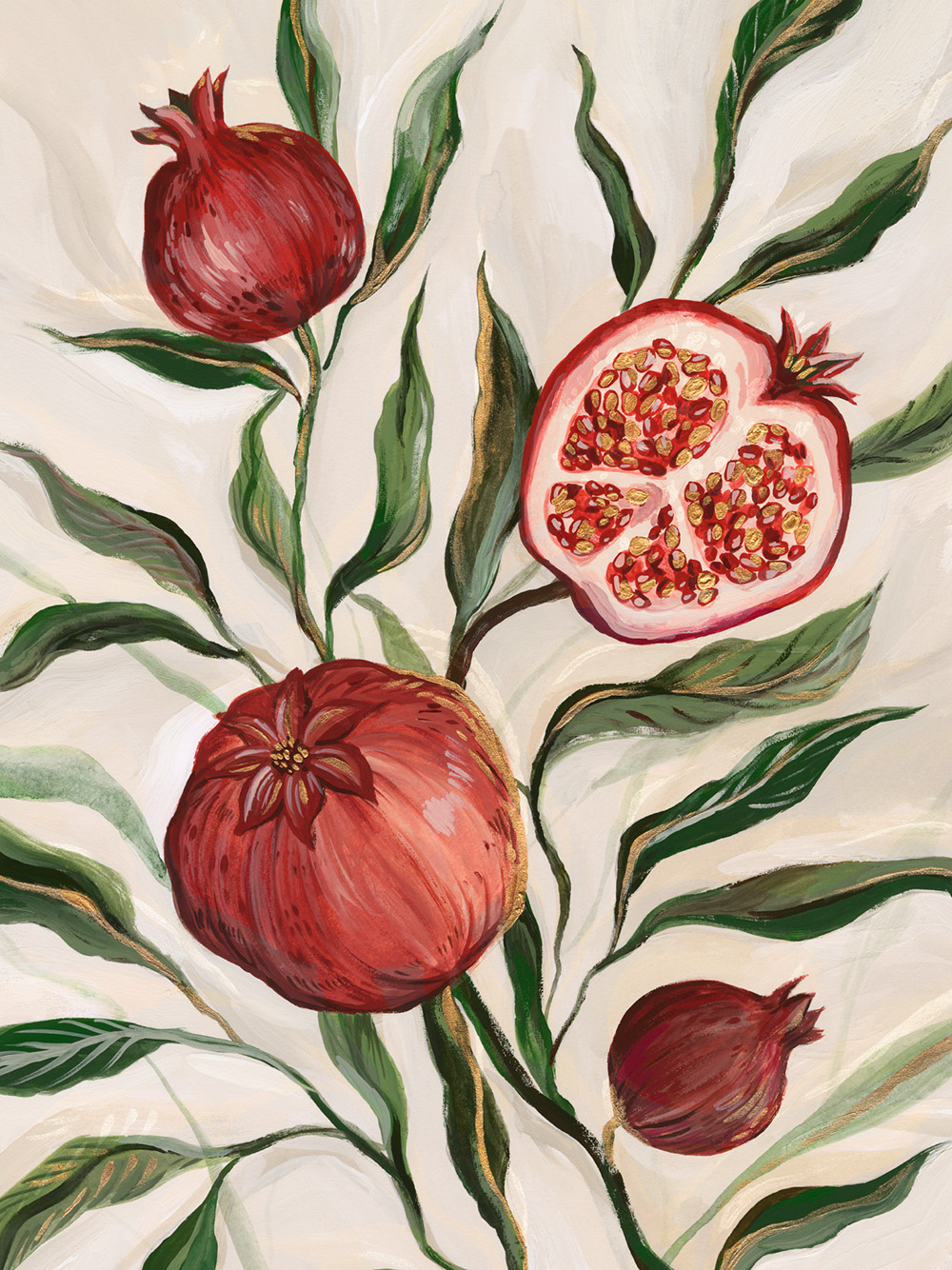 Krásný plakát s červenými granátovými jablky se zelenými listy na světlém pozadí. Jedno granátové jablko je nakrojené, aby byly vidět semínka uvnitř.