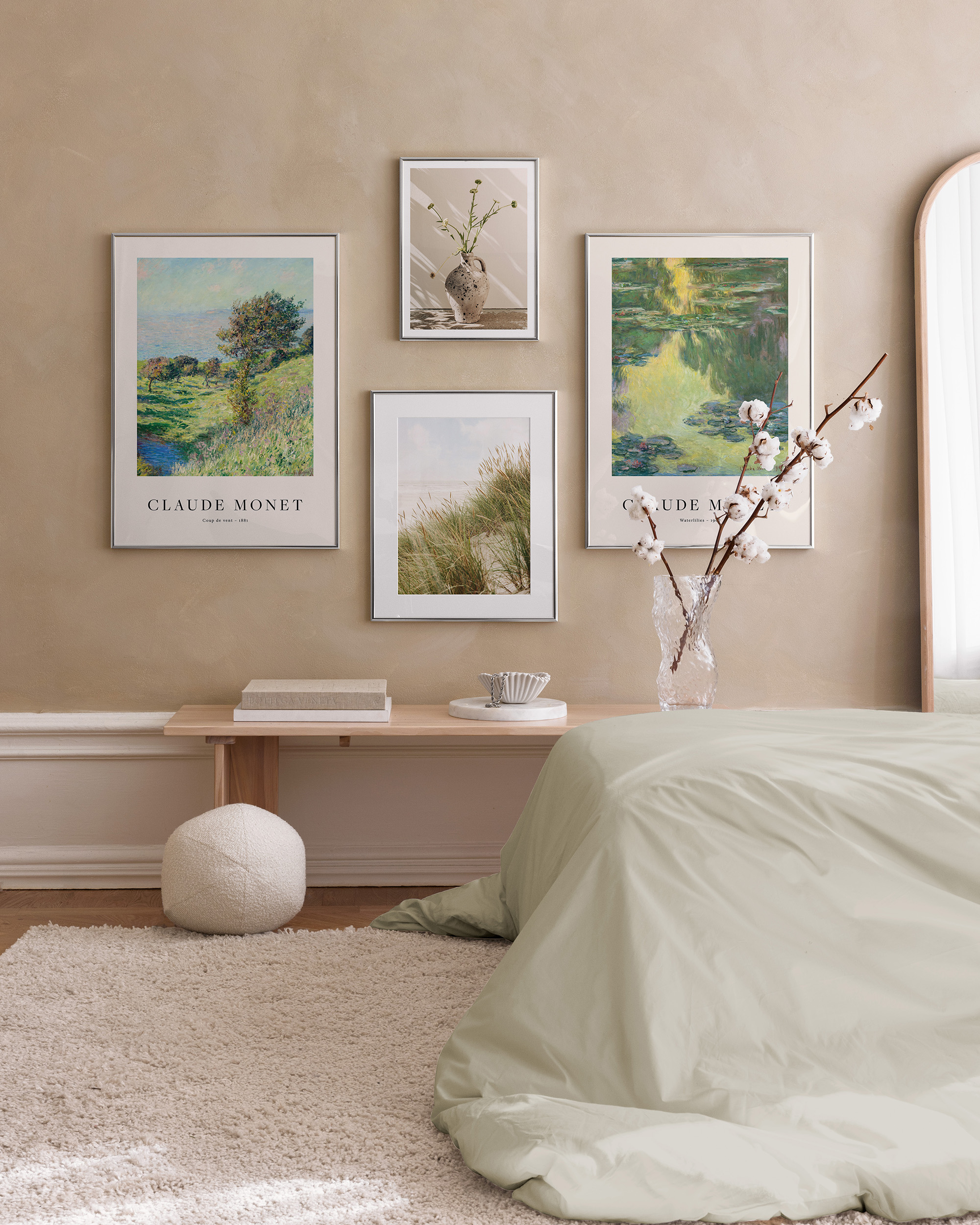 Plakát se skvrnitou béžovou vázou se zelenými stonky a malými květy. Jemné stíny vytvářejí klidný a přirozený vzhled na světlé stěně.