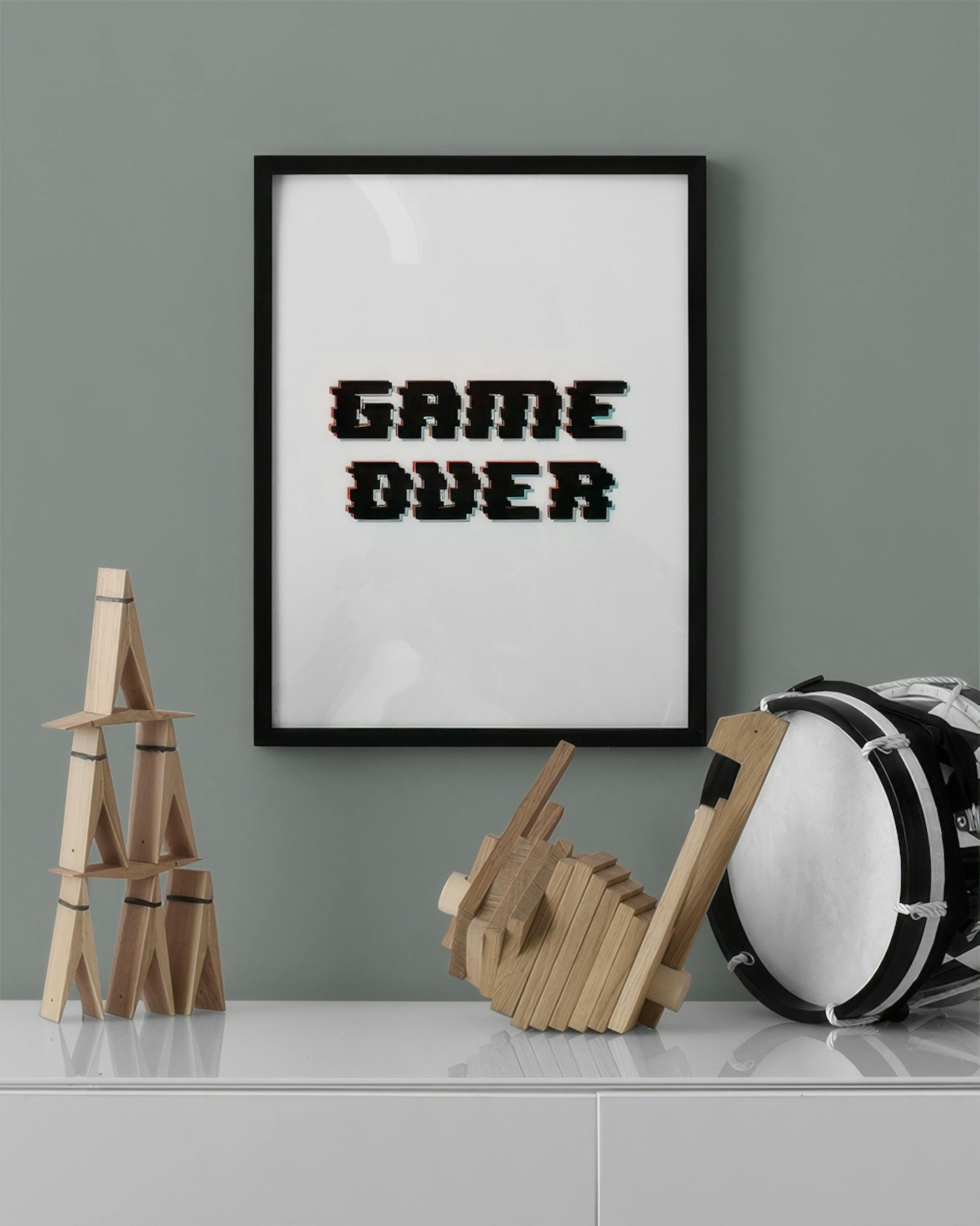 'Textový plakát s větou ''Game over'' v černé barvě s černo-zeleným stínem tvořícím 3D efekt. Bílé pozadí. Pověste si tento plakát do herní místnosti, jako veselý prvek!'