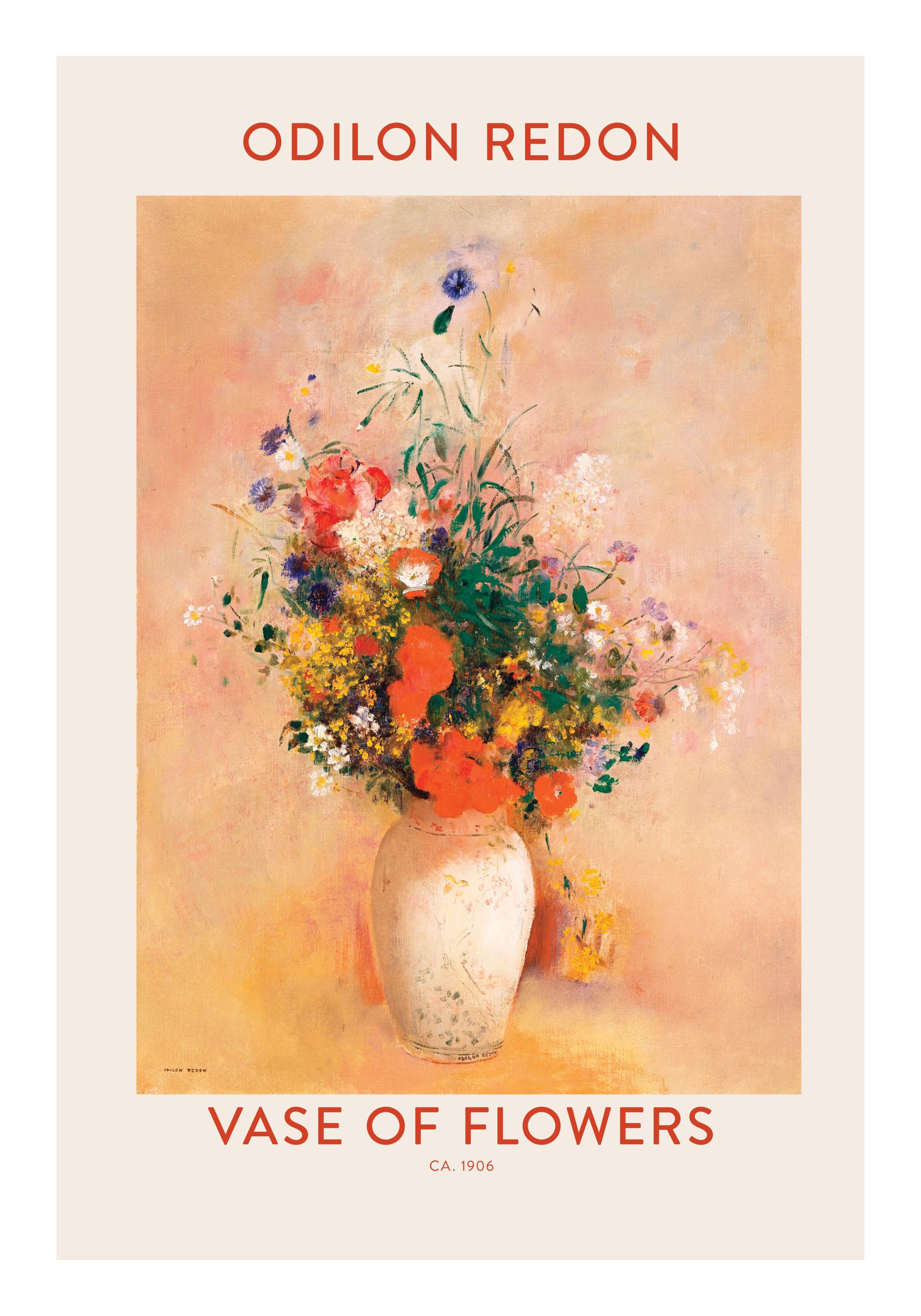 Od 322 KčMalba s motivem barevných květin v béžové váze na oranžovém pozadí s textem v horní a spodní části na světle béžovém pozadí. Plakát je vytištěn s bílým okrajem kolem motivu. Malíř: Odilon Redon