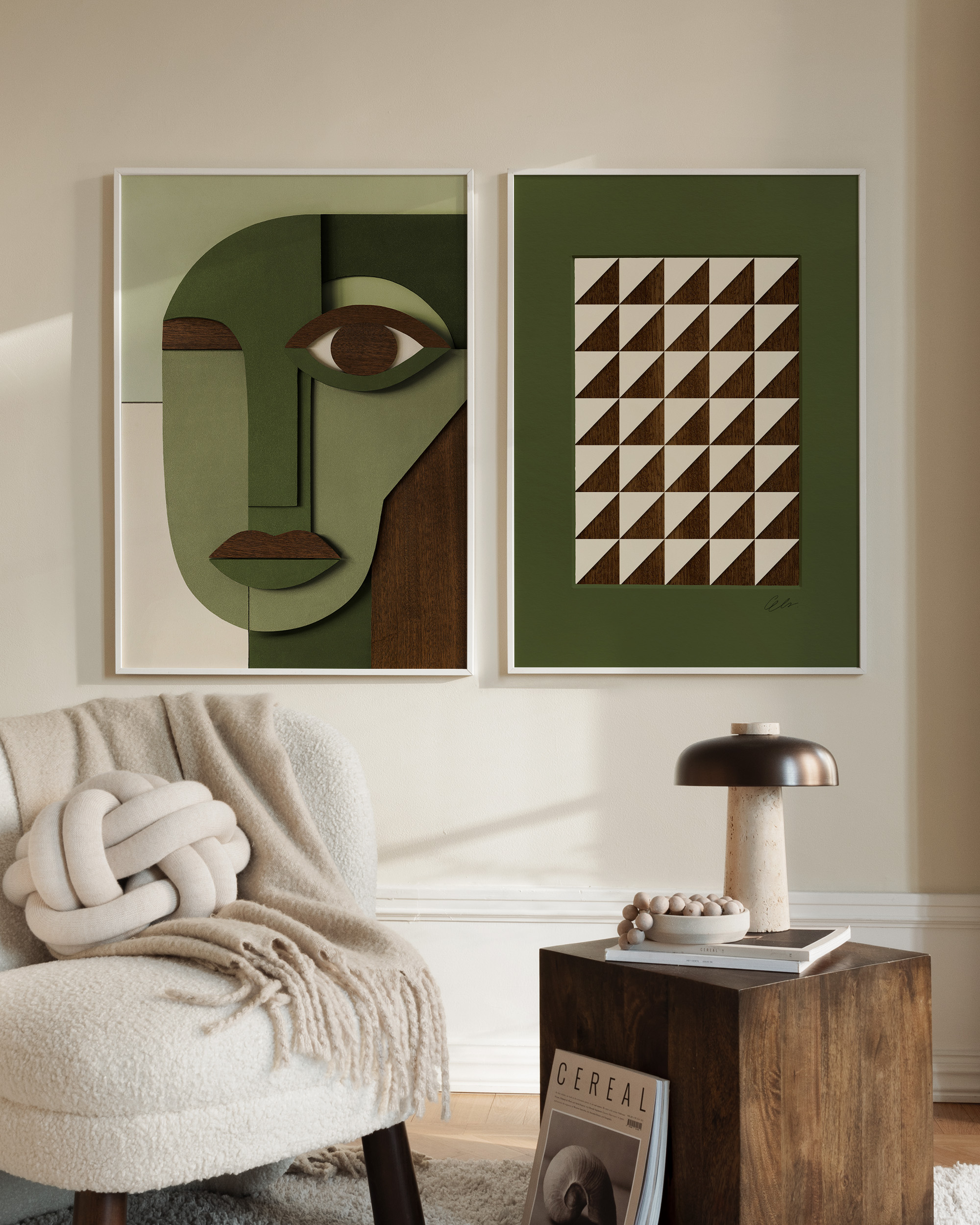 Abstraktní poster obličeje vytvořeného z geometrických tvarů v zelených a hnědých tónech. Vrstvený design působí jako koláž s velkým okem, jednoduchým nosem a hnědými rty na jemném pozadí.