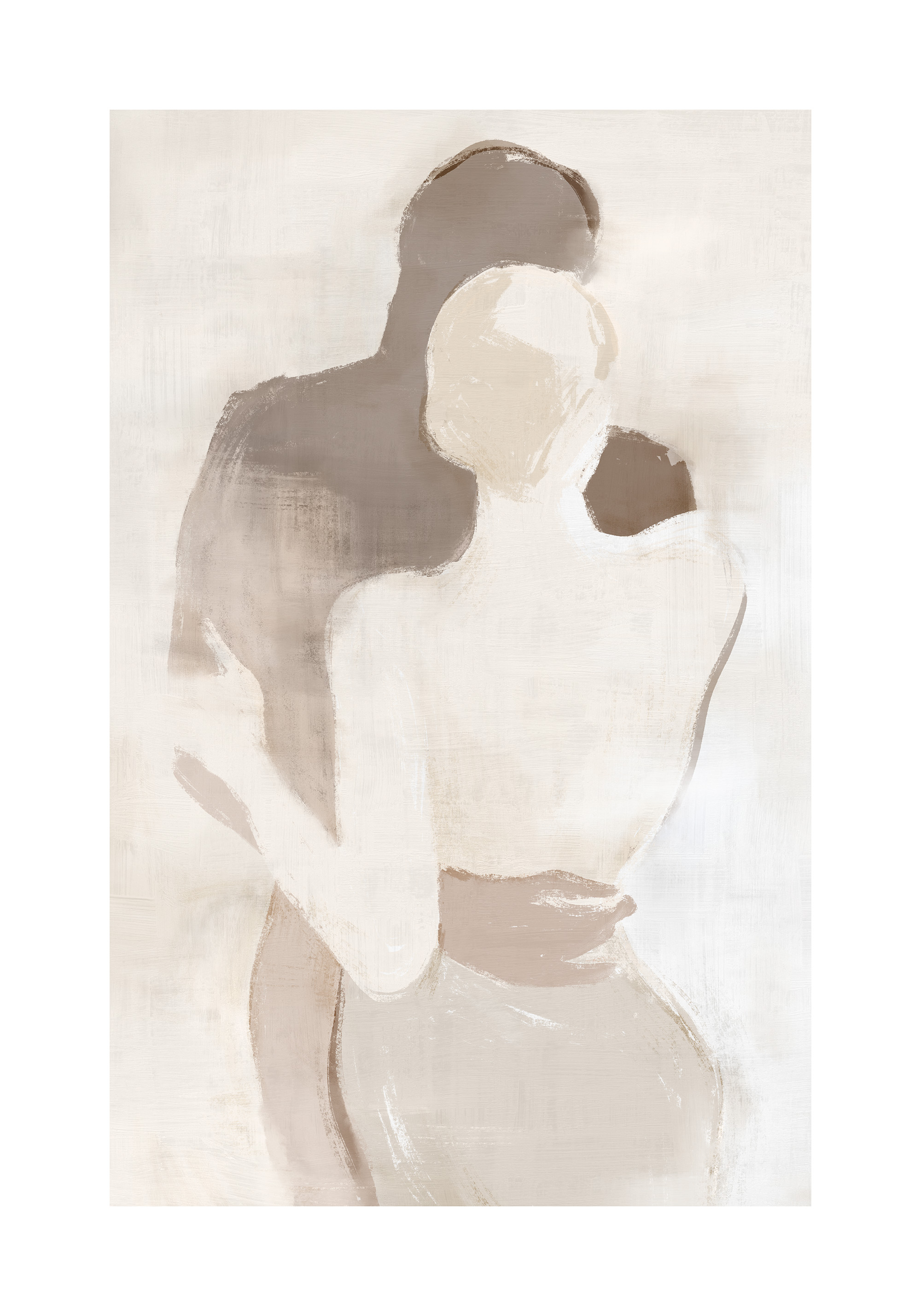 Ilustrace něžného objetí v jemných béžových a bílých odstínech. Použijte tento plakát k přidání nádechu intimity a něhy do vašeho prostoru. Je to dokonalá volba do ložnice nebo útulného obývacího prostoru.
